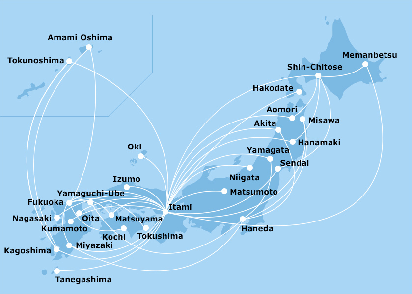 | Itami | ⇔ | Hakodate/Aomori/Misawa/Akita/Hanamaki/Yamagata/Sendai/Niigata/Izumo/Oki/Matsuyama/Oita/Fukuoka/Nagasaki/Kumamoto/Miyazaki/Kagoshima