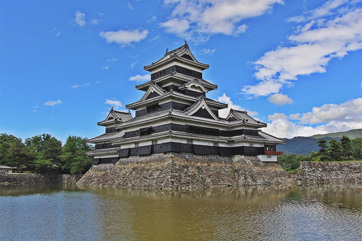 春の桜、夏の新緑、秋の紅葉、冬の冠雪した北アルプスと、四季折々のお城との風景を楽しめます。城の周囲には水堀りがあり晴れた日には美しい天守が水面に映る様が魅力です。