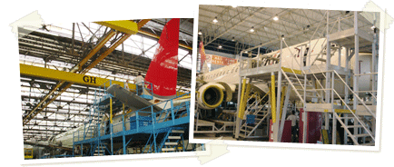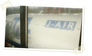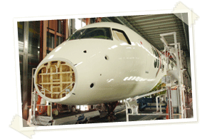 ペイント工場は24時間フル稼働。また、この工場でエンブラエル全機種のペイントが行われているため、いつもたくさんの機体でいっぱいである。連絡を受けて早速ペイント工場に入ると、他社機の奥にジェイ・エア初号機を発見。白くペイントされた胴体に、JALロゴとJ-AIRの文字がマスキングされていた。機体にロゴが入れば、もうすぐペイントも完了だ。