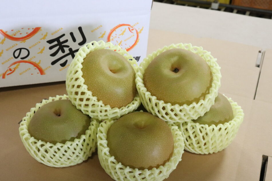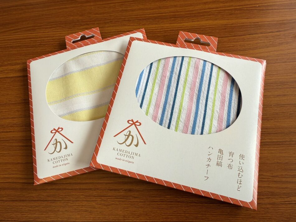 ・新潟市江南区からは、みずみずしくシャキシャキとした食感が楽しめる梨「幸水」と、明治時代から伝わるシンプルで落ち着いたデザインに丈夫な素材が魅力の木綿織物「亀田縞」。
